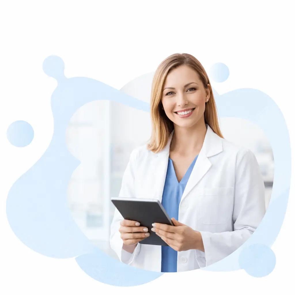 Professional female Clinical Research Professional with fair skin in a modern medical office holding a clipboard, warm confident smile